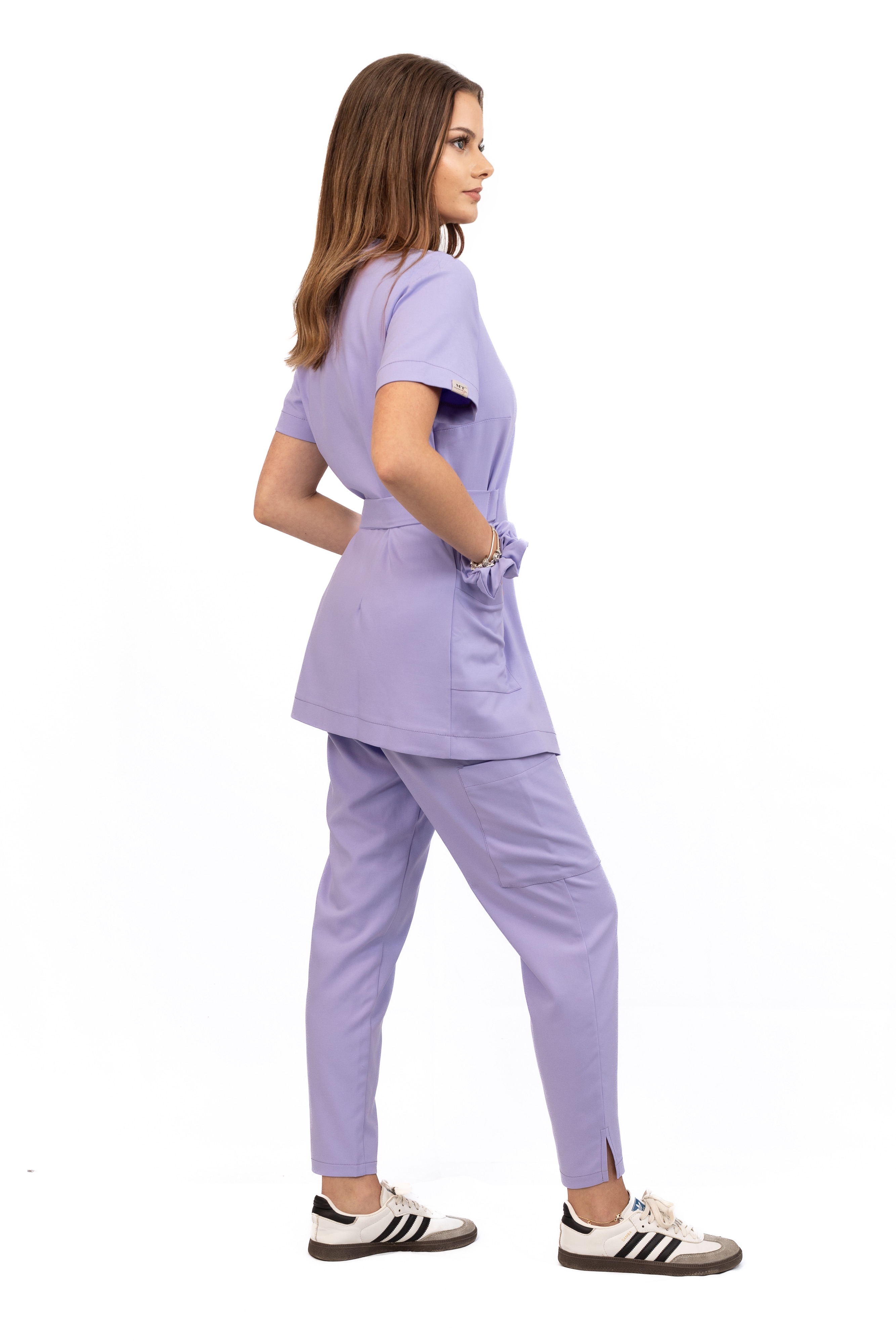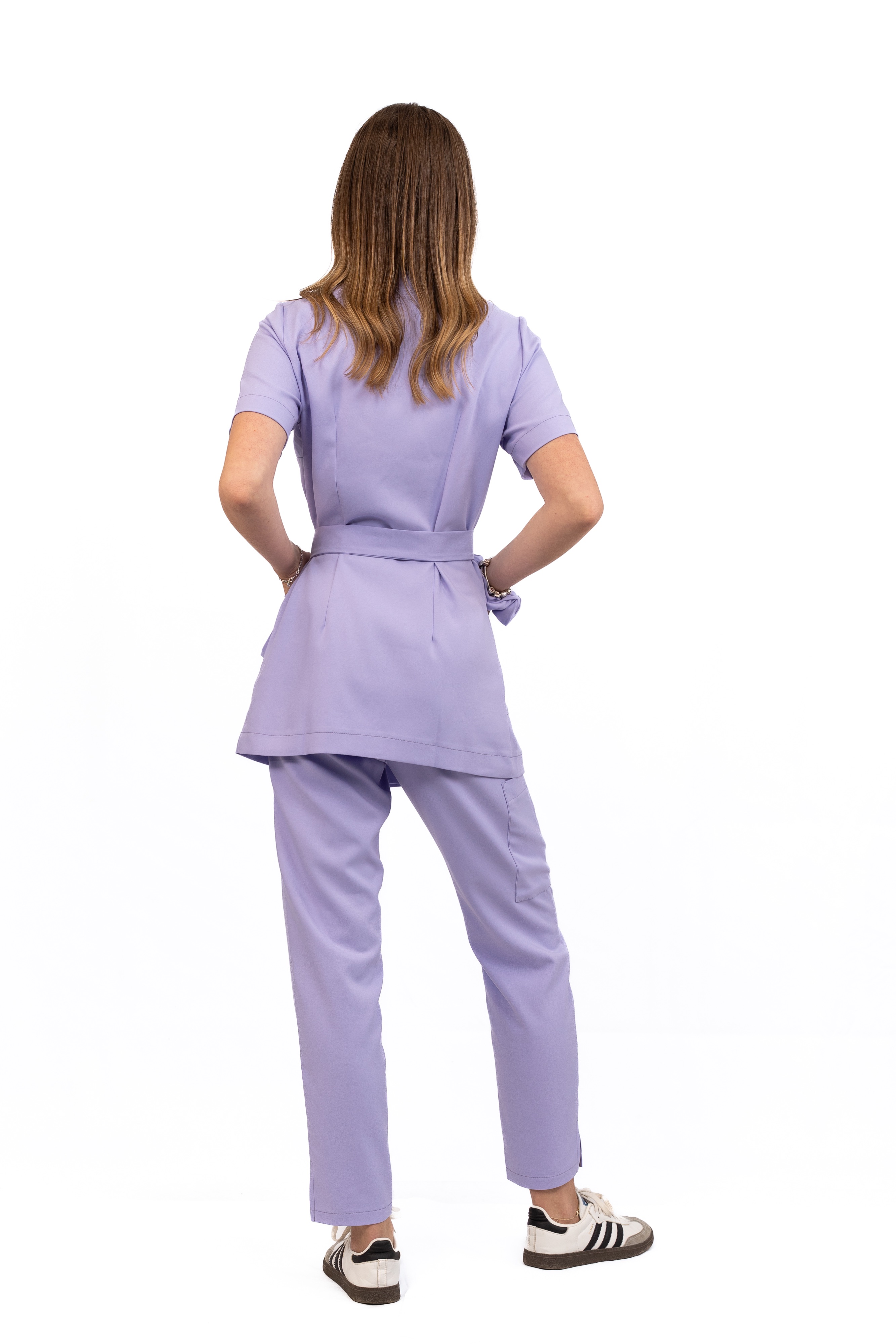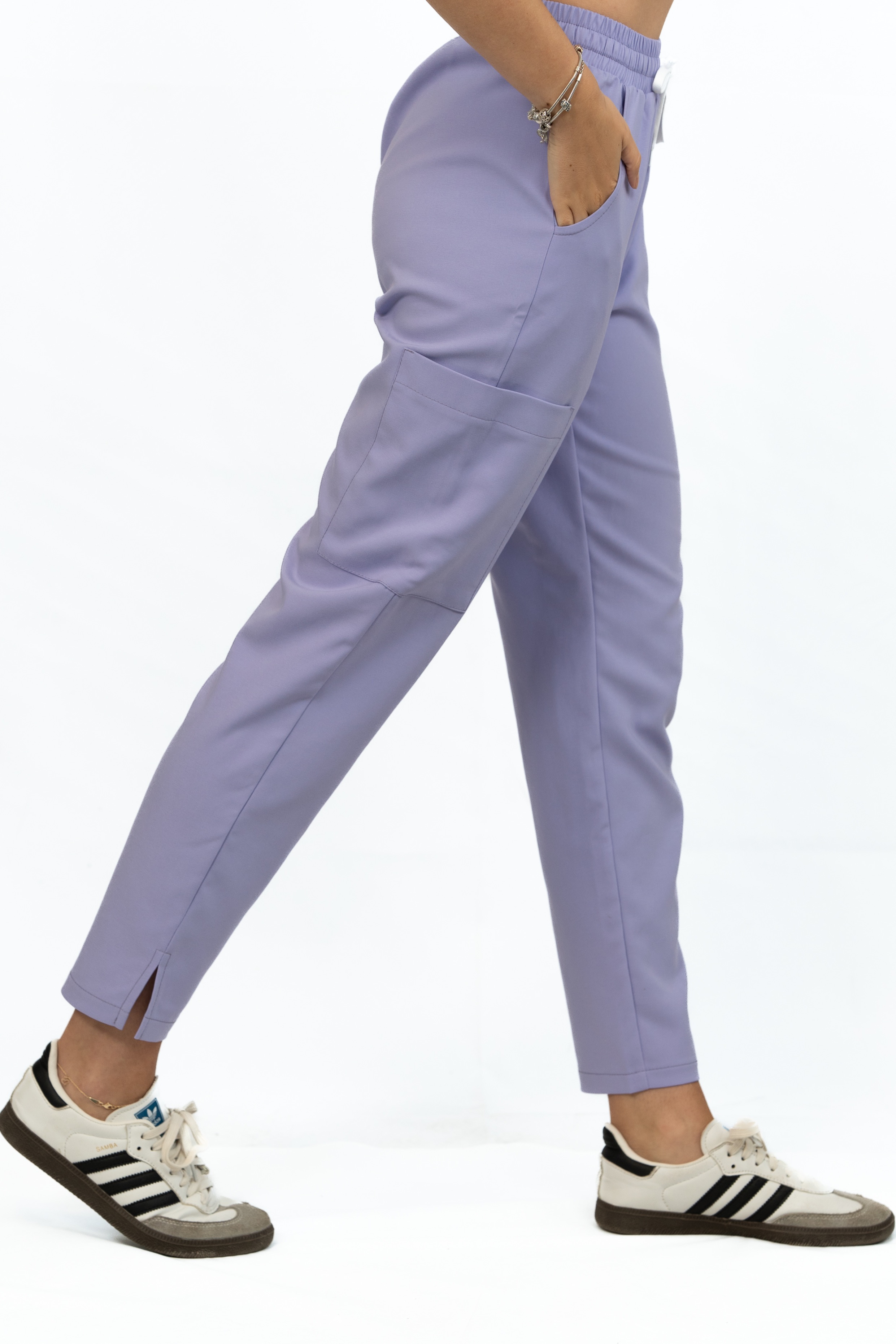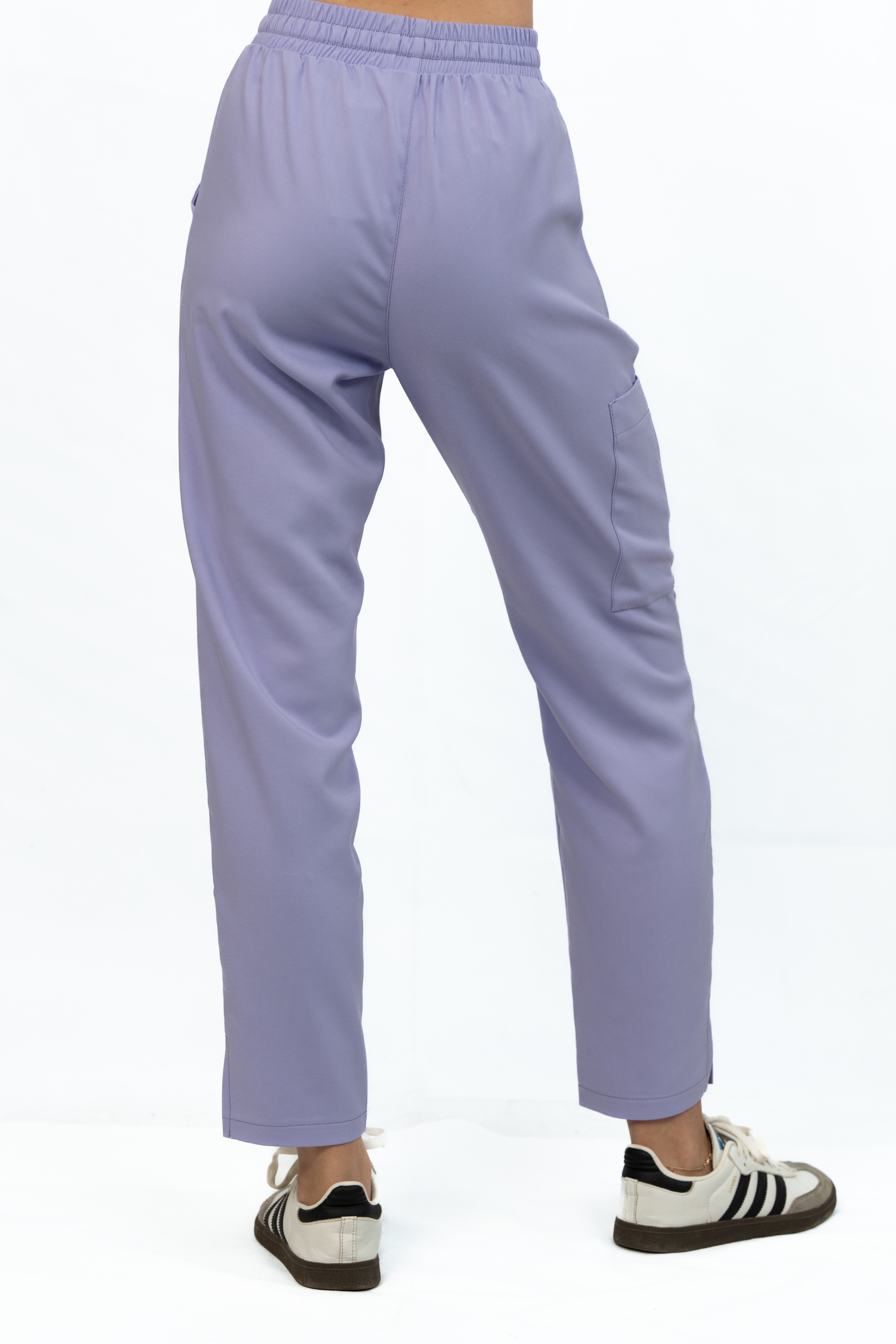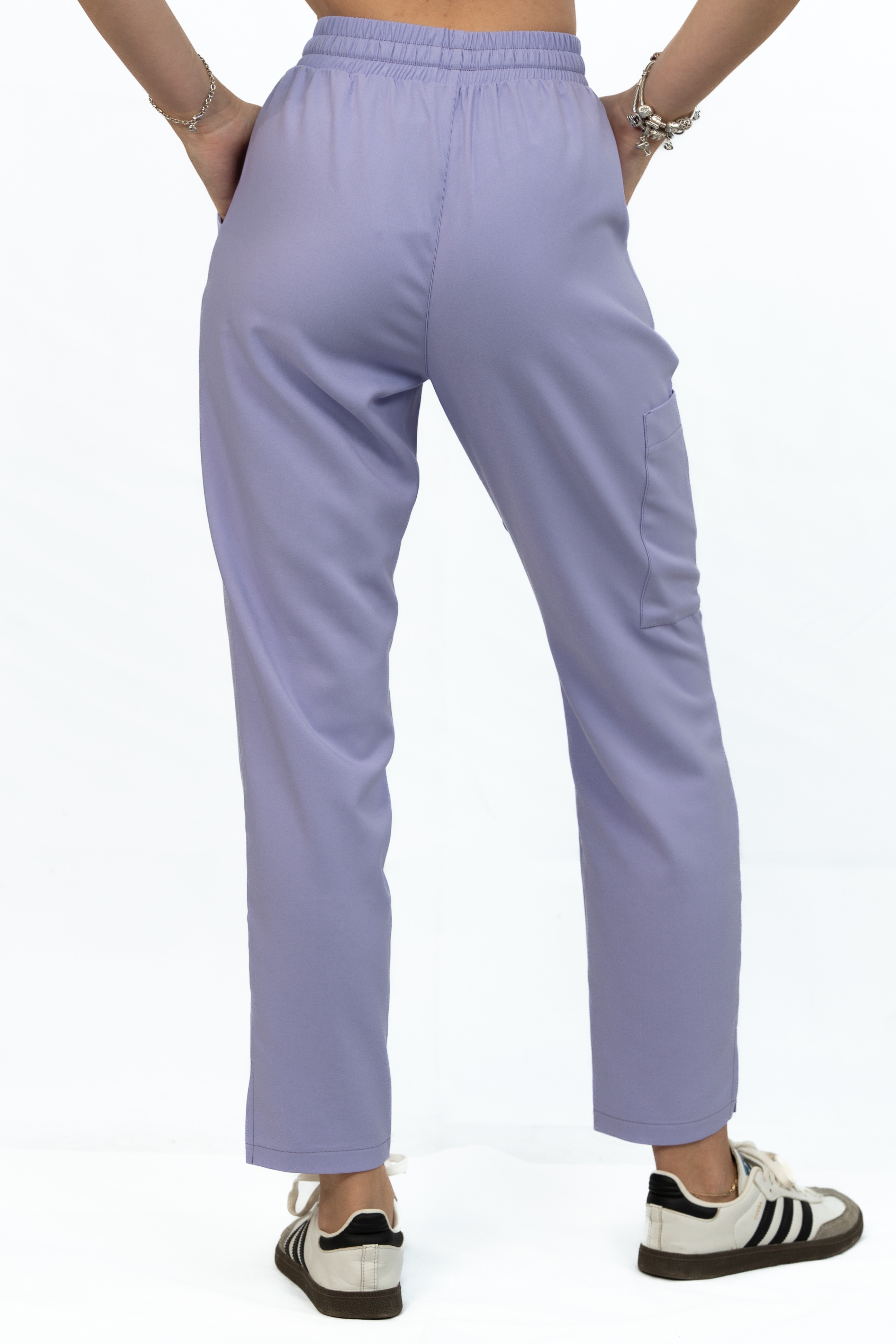 Kolor Soft Iris to subtelna, pastelowa lawenda, która dodaje lekkości i świeżości. Nowoczesny krój ze zwężanymi nogawkami i delikatnym rozporkiem podkreśla smukłą sylwetkę, zapewniając jednocześnie pełną swobodę ruchu.