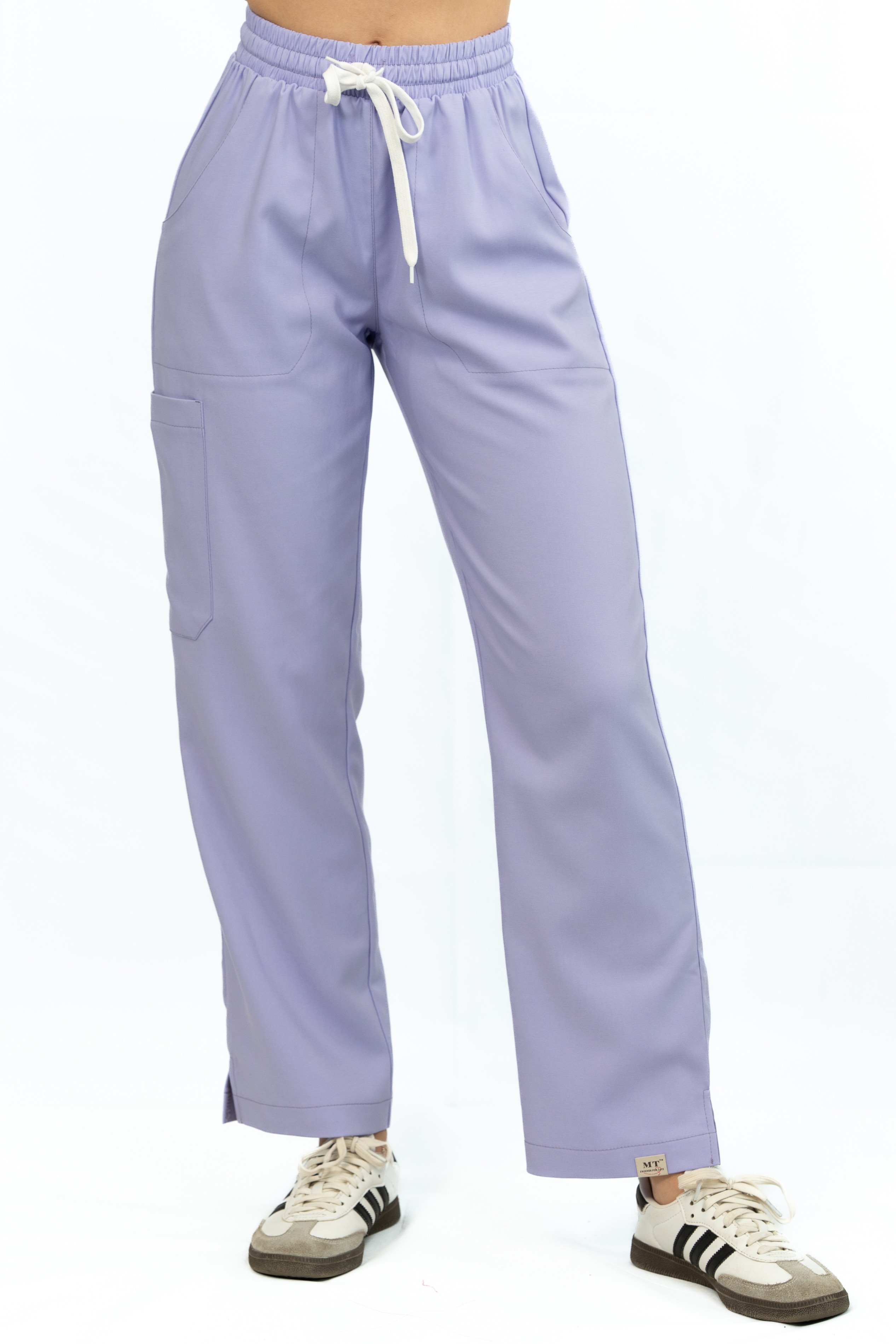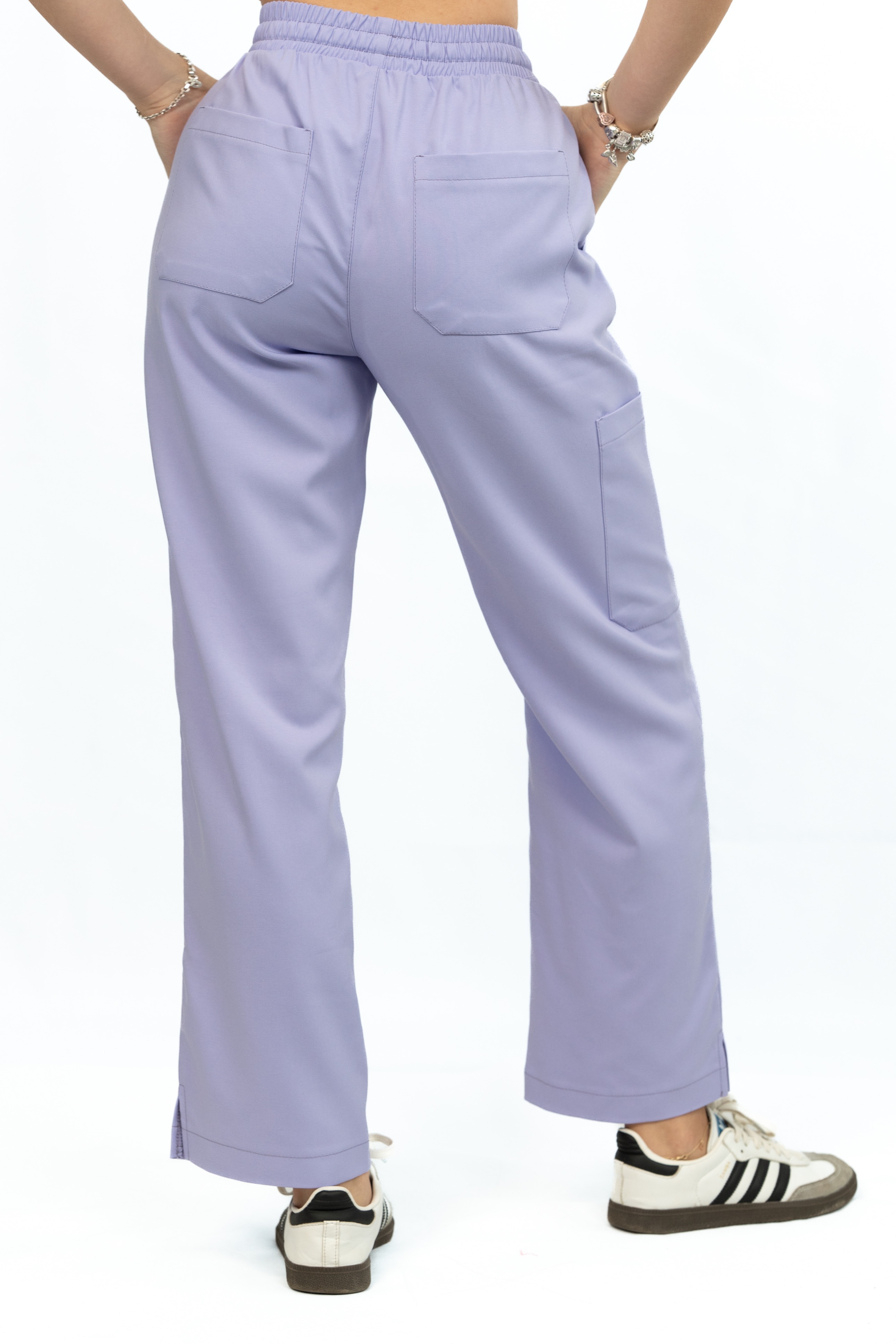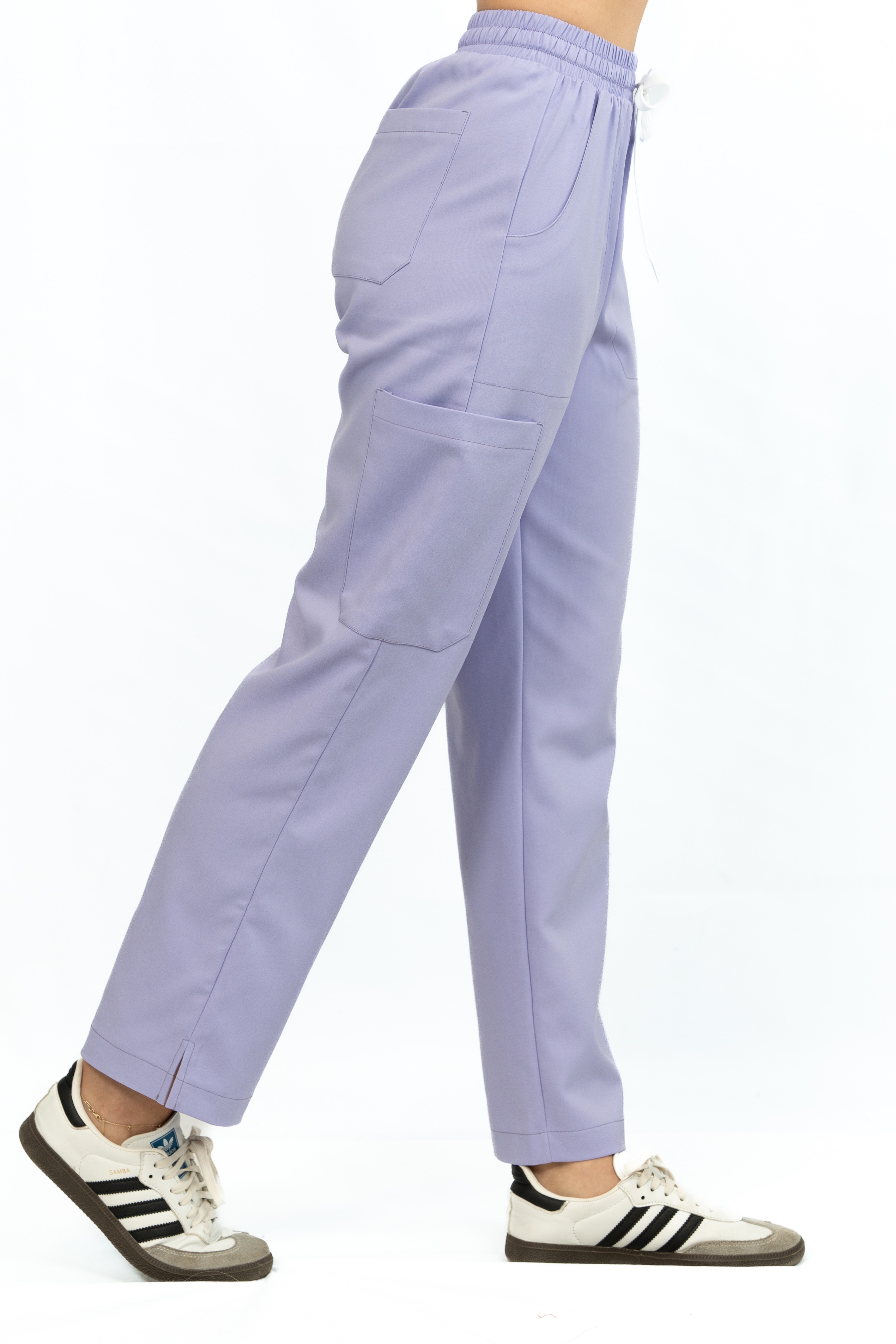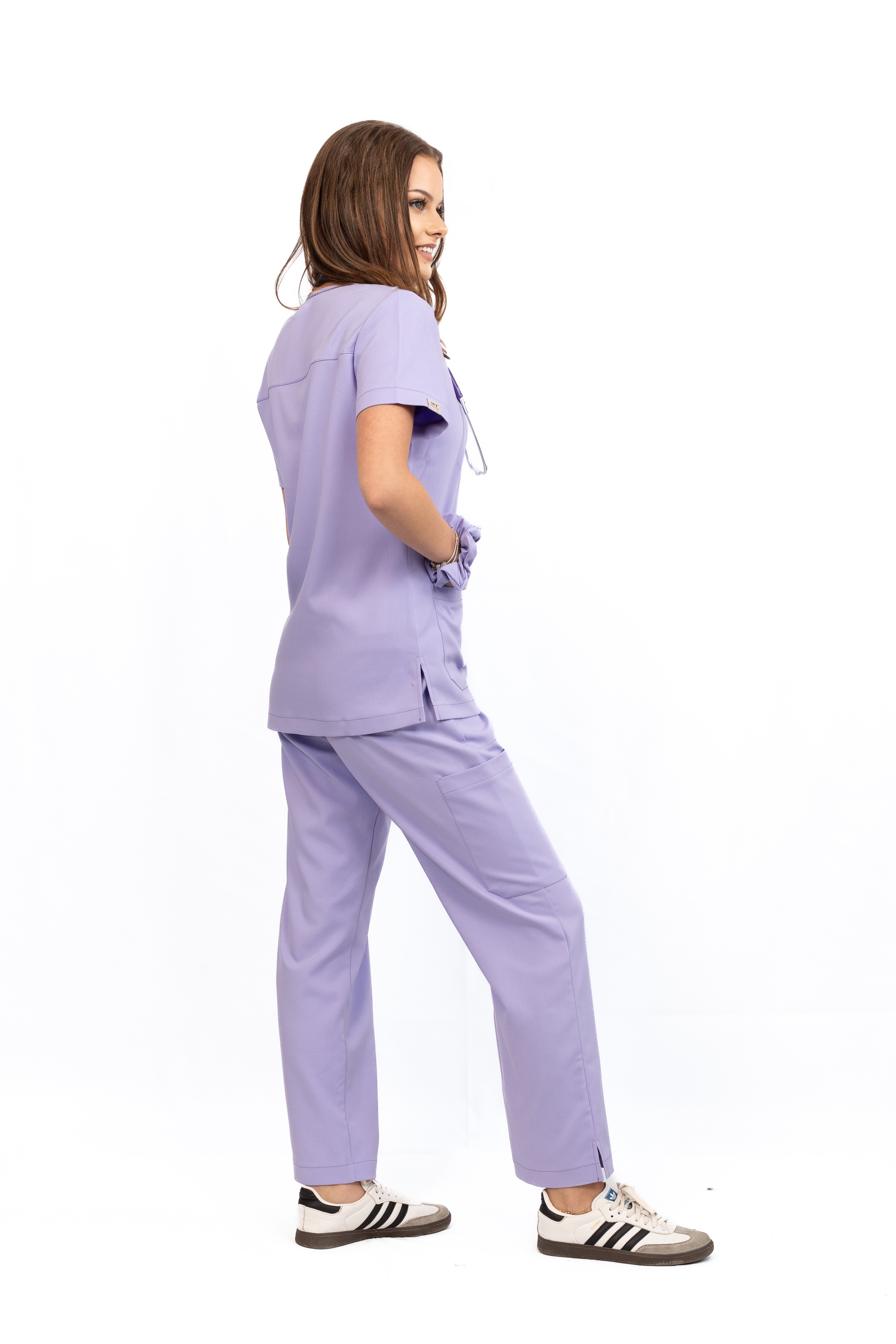 Lawendowy odcień i prosty fason z rozcięciem przy nogawce nadają całości lekkości i subtelnej elegancji. Idealne do pracy w gabinecie, przychodni czy szpitalu.